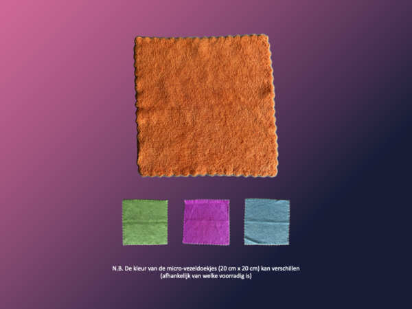 Een klein (20 x 20 cm) micro-vezeldoekje dat makkelijk kan worden opgeborgen en goed wist. Het an zijn in deze verschillende kleuren, afhankelijk van wat voorradig is. Als je een voorkeur hebt, geef dit dan door in de opmerking van de bestelling.
